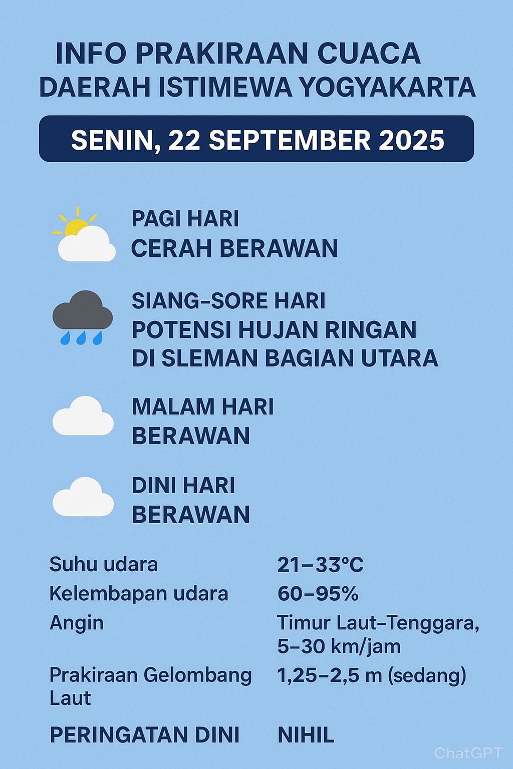 Sementara itu, dalam prospek cuaca tiga harian periode 22–24 September 2025, BMKG memprediksi potensi hujan ringan tetap berpeluang terjadi di Sleman bagian utara pada 22 dan 24 September.