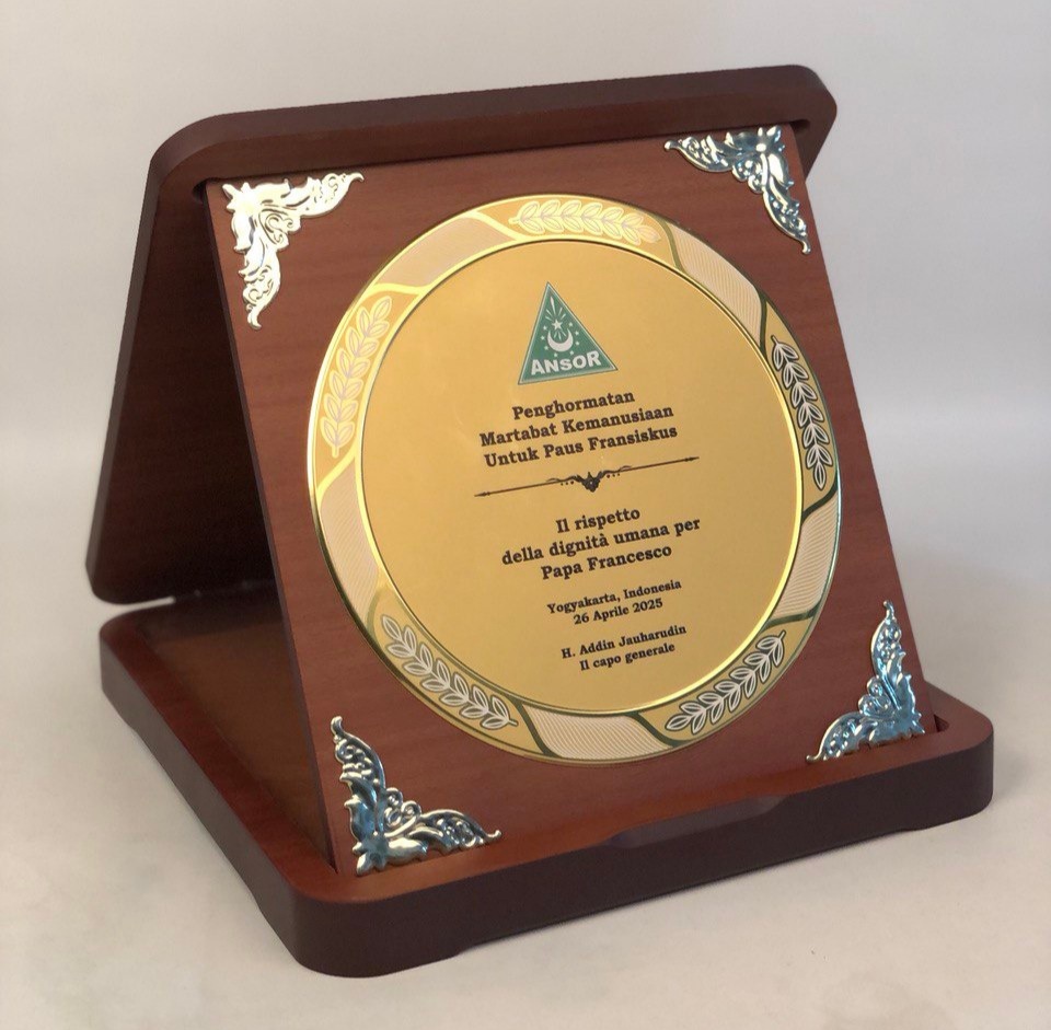 Dalam anugerah yang berbentuk plakat ini tertulis Penghormatan Martabat Kemanusiaan untuk Paus Fransiskus. Dan di bawah ungkapan tersebut, ada tulisan dalam bahasa Itali yakni,“ Il rispetto della dignita umana per Papa Francesco“ – yang artinya sama dengan ungkapan berbahasa Indonesia di atasnya. Dan kedua tulisan itu diakhiri dengan Yogyakarta, Indonesia, 26 Aprile 2025 – H. Addin Jauharudin / Il capo generale.