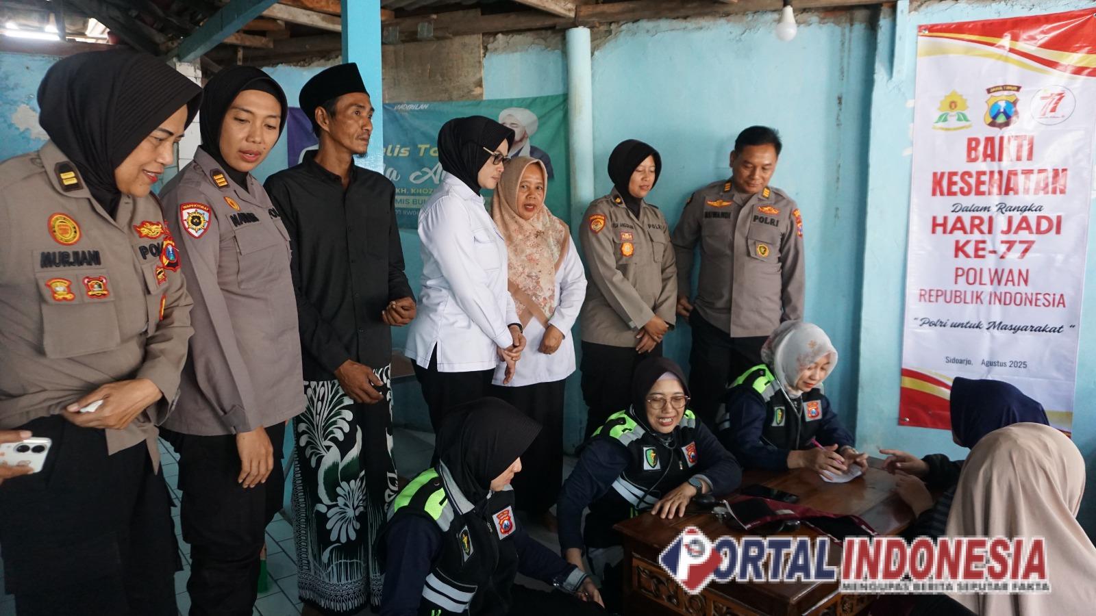 SIDOARJO — Menyambut Hari Jadi Polisi Wanita (Polwan) Republik Indonesia ke-77 yang diperingati 1 September 2025, Polwan Polresta Sidoarjo menggelar kegiatan bakti kesehatan di Dusun Tanggulrejo RT 03 RW 06, Kecamatan Porong, Kabupaten Sidoarjo, Rabu (27/8/2025).