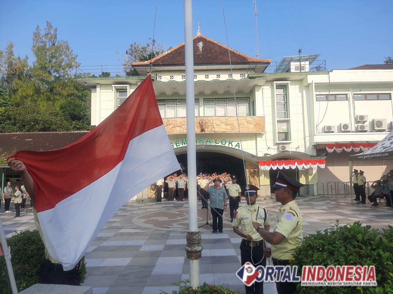 Upacara 17-an diikuti segenap karyawan dan direksi kebun binatang di Yogyakarta itu. Bertindak sebagai inspektur upacara (Irup) Joko.