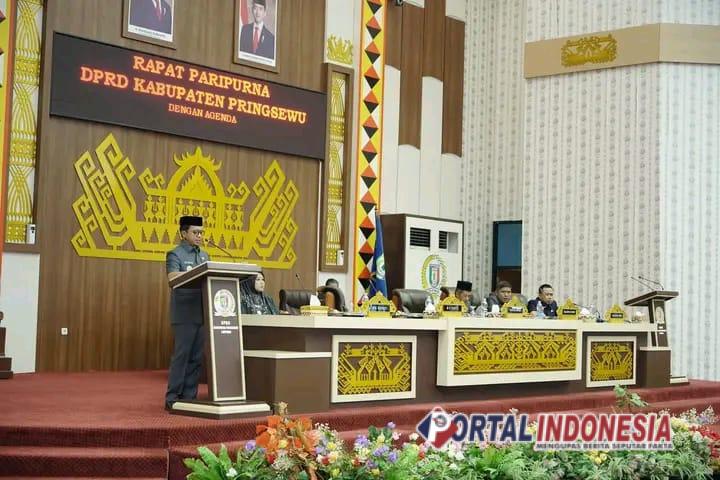 Bupati Pringsewu Riyanto Pamungkas saat menyampaikan Rancangan Peraturan Daerah (Ranperda) Pembentukan Pekon Kresnomulyo Barat, Kecamatan Ambarawa dan Pekon Sukamanah, Kecamatan Adiluwih, pada Rapat Paripurna DPRD Pringsewu, Rabu (14/5/2025), mengatakan pertimbangan awal dibentuknya kedua pekon baru tersebut didasari keinginan agar pembangunan pekon dapat lebih merata dan efektif, sehingga dapat meningkatkan kualitas SDM dan mempercepat kesejahteraan masyarakat, terutama segi perekonomian.