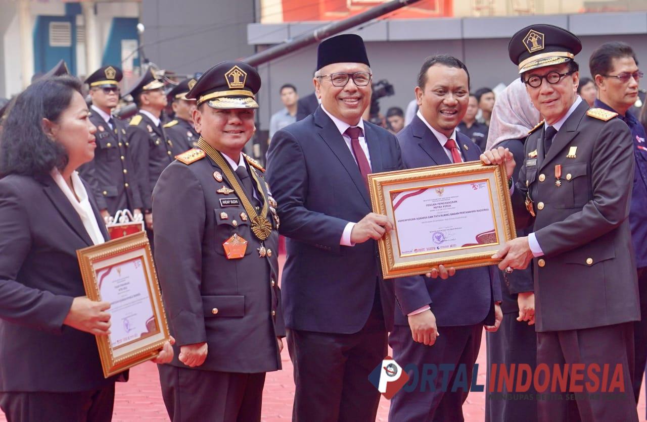 Penghargaan itu diterima oleh Suyus Windayana selaku Sekretaris Jenderal (Sekjen) Kementerian ATR/BPN dalam hal ini mewakili Menteri Agus Harimurti Yudhoyono, saat menghadiri upacara Hari Pengayoman ke-79 Tahun 2024 di Lapangan Kementerian Hukum dan Hak Asasi Manusia (HAM), Jakarta, Senin (19/08).
