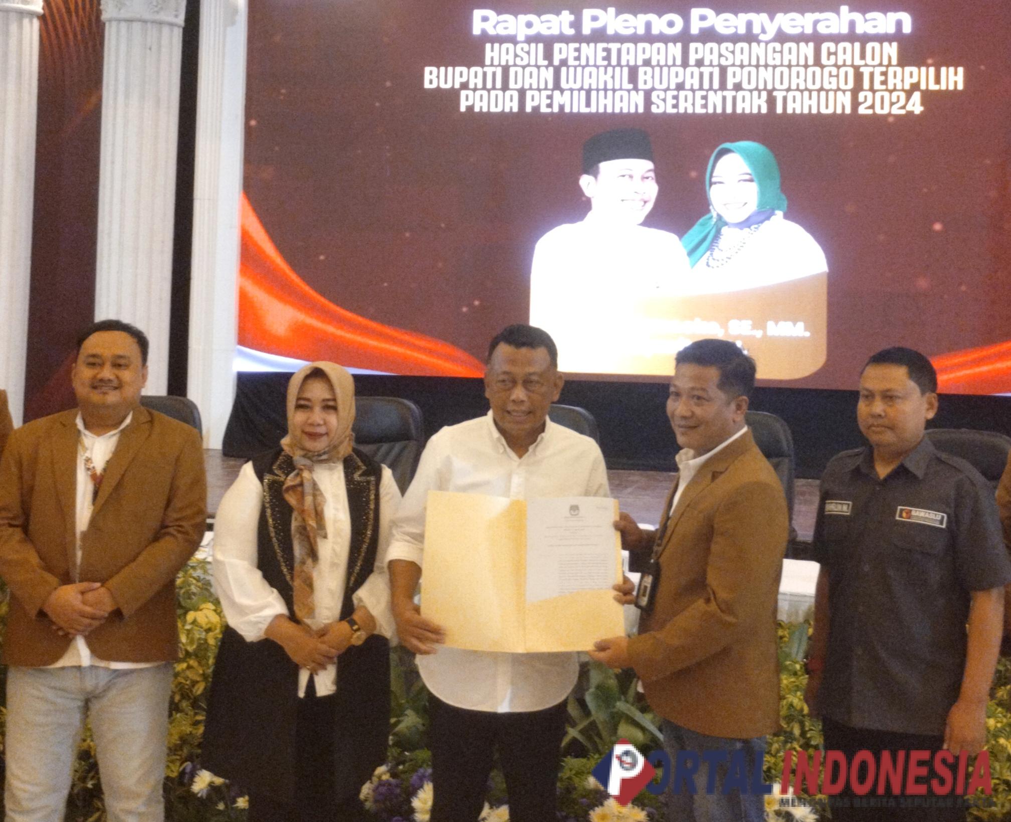 PONOROGO – Komisi Pemilihan Umum (KPU) Ponorogo resmi menetapkan Bupati dan Wakil Bupati terpilih pada Pemilihan Kepala Daerah (Pilkada) 2024.