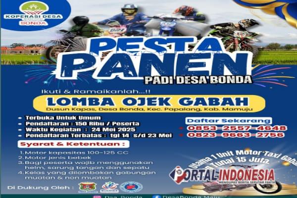 MAMUJU – Suasana pesta panen padi di Desa Bonda, Kabupaten Mamuju, Sulawesi Barat, akan semakin semarak dengan digelarnya lomba ojek gabah pada 24 Mei 2025 mendatang. Kegiatan ini terbuka untuk umum dengan biaya pendaftaran sebesar Rp 150.000 per peserta.