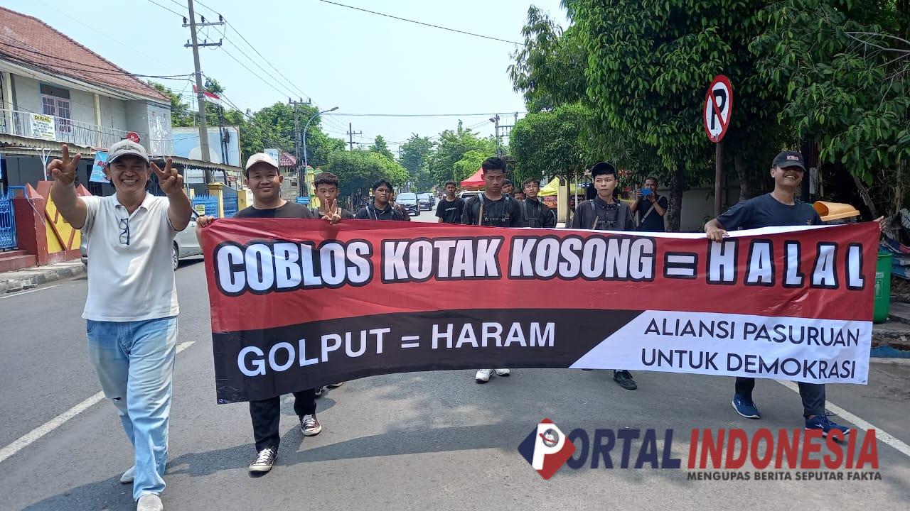 Dengan membentangkan spanduk bertuliskan ‘Coblos Kotak Kosong = Halal, dan Golput = Haram’, tampak para pegiat itu berjalan kaki sembari diiringi musik drumband menyusuri ke sejumlah titik jalan yang tersebar di 4 kecamatan yang ada di Kota Pasuruan.