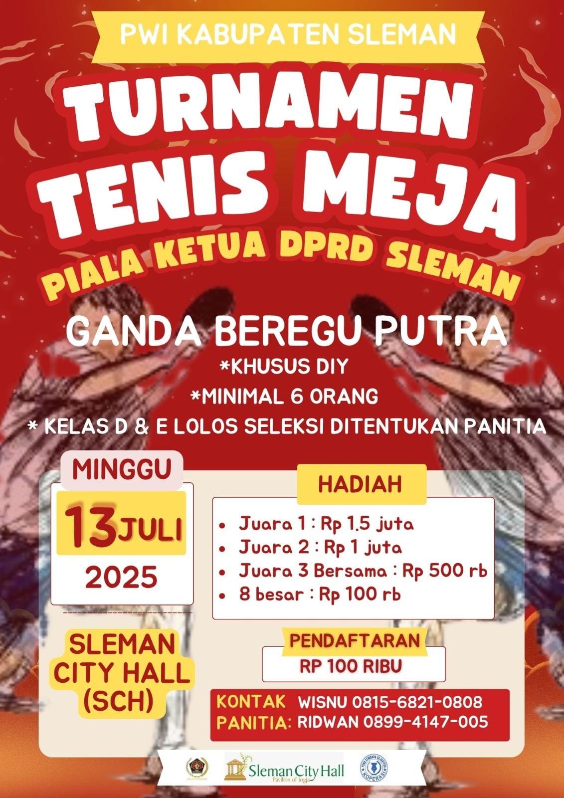 SLEMAN – Persatuan Wartawan Indonesia (PWI) Kabupaten Sleman akan menggelar Turnamen Tenis Meja memperebutkan Piala Ketua DPRD Sleman. Ajang olahraga ini akan digelar pada Sabtu (12/7) dan Minggu (13/7) di Sleman City Hall (SCH).