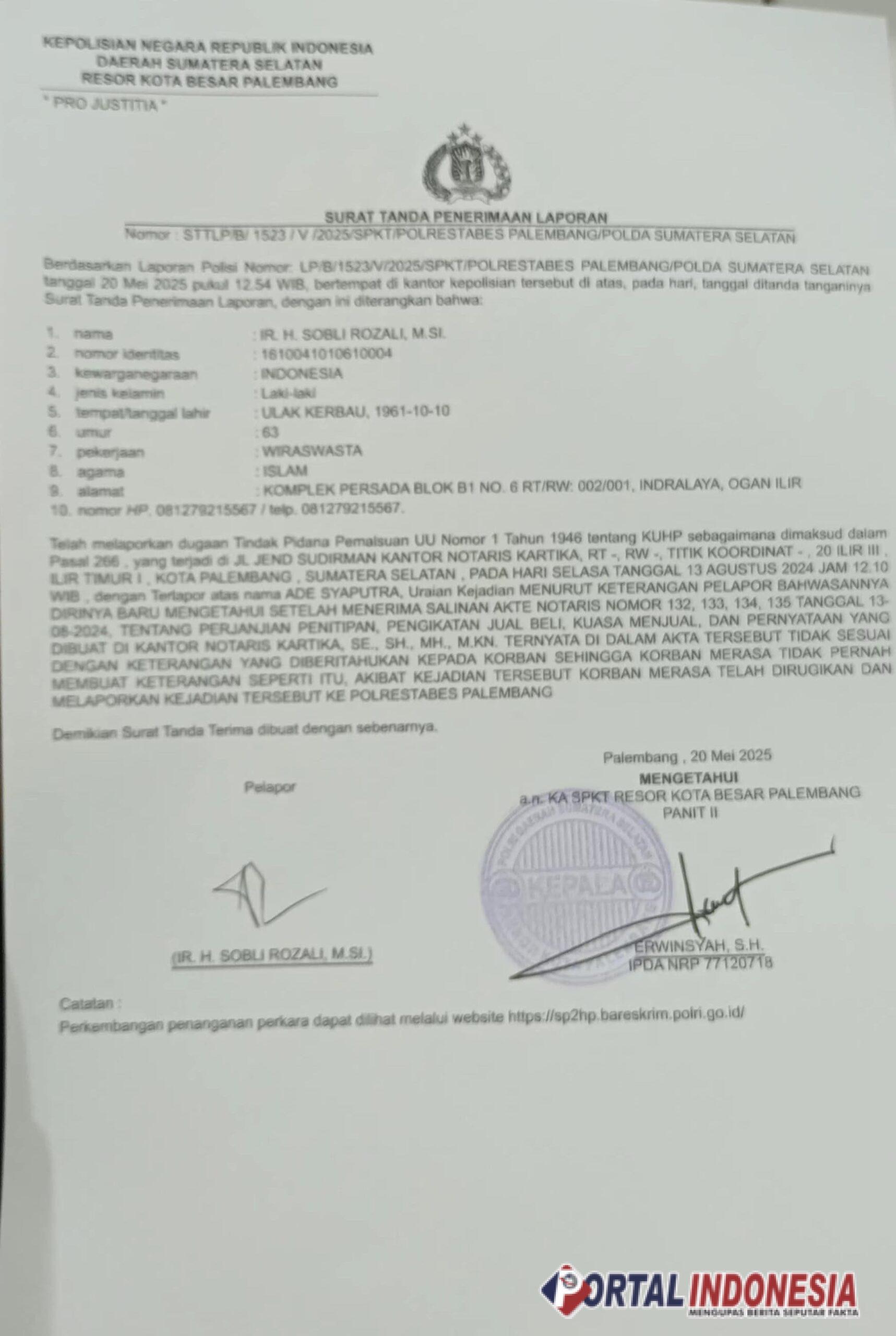 Laporan terbaru ini tercatat di Polrestabes Palembang dengan nomor: 1523/V/2025/Polrestabes Palembang tertanggal 20 Mei 2025.