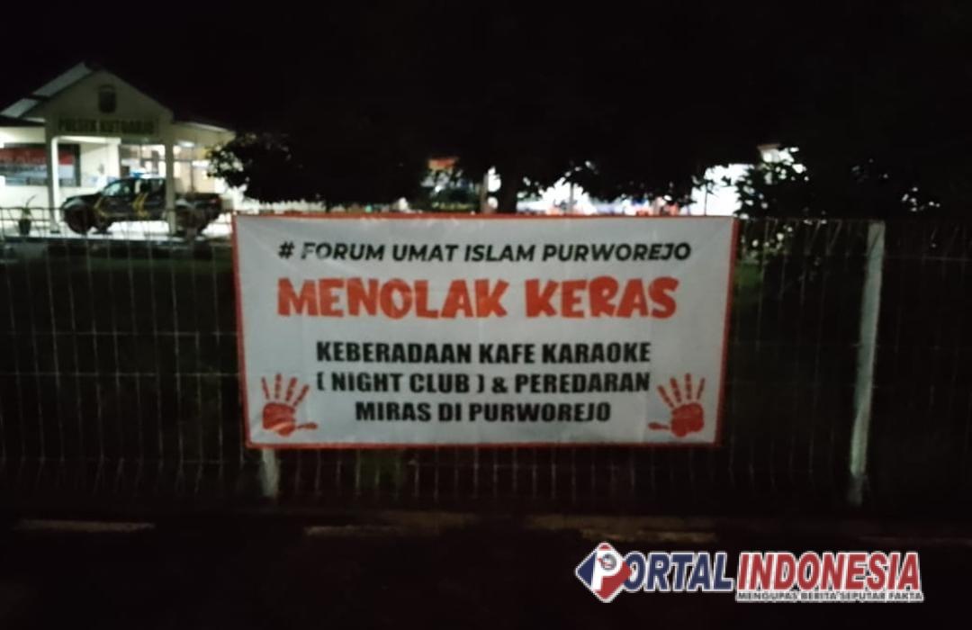 PURWOREJO – Belasan banner dan spanduk bertuliskan “Forum Umat Islam Purworejo menolak keras keberadaan kafe karaoke (night club) dan peredaran miras di Purworejo terpasang di sejumlah titik di wilayah Kecamatan Kutoarjo, Kabupaten Purworejo.