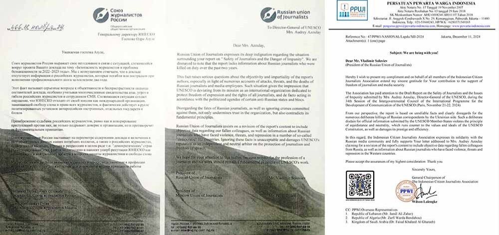 Terkait keberatan terhadap hasil kerja UNESCO tersebut, PPWI menyampaikan rasa solidaritasnya kepada segenap pekerja media massa Rusia dan mendukung penuh surat Presiden Persatuan Wartawan Rusia, Vladimir Soloviev, yang ditujukan kepada pimpinan UNESCO, Audrey Azoulay. Surat dari para wartawan Rusia tersebut pada intinya berisi tuntutan agar isi laporan direvisi dengan memasukkan data objektif terkait rekan-rekan jurnalis Rusia yang gugur, serta informasi mengenai jurnalis Rusia yang menghadapi kekerasan, ancaman, dan penindasan di Ukraina dan negara-negara Barat.