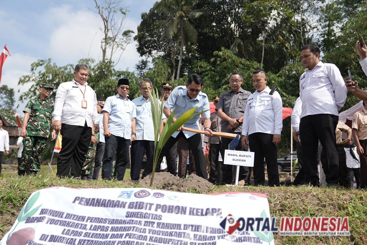 SLEMAN – Wakil Bupati Sleman, Danang Maharsa, bersama Balai Pemasyarakatan (Bapas) Kelas I Yogyakarta dan jajaran Forkopimda Sleman melakukan penanaman bibit kelapa di Hargobinangun Agro Park, Pakem, pada Selasa (9/9/2025).